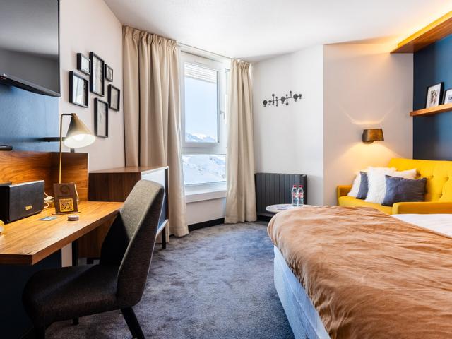 Dubbelrum Komfort med extrabädd, bad/dusch och WC. Rummet har plats för två vuxna + ett barn (upp till 15 år). Utsikt mot pisten.