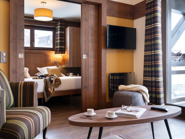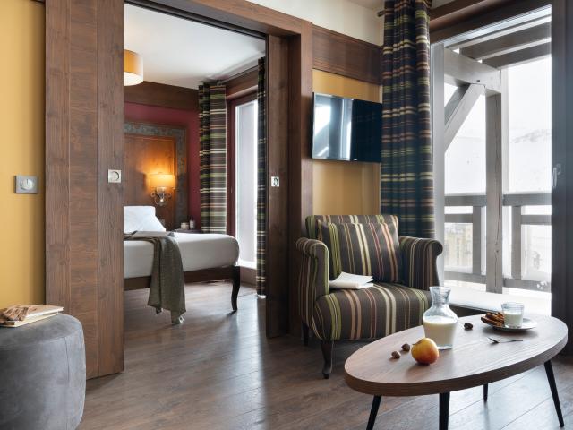 Trerumslägenhet Superior, ett sovrum med dubbelsäng och ett med två enkelsängar, vardagsrum, pentry, två bad/dusch och WC samt balkong.