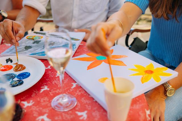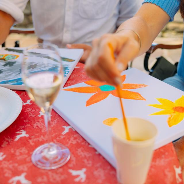 Väl tillbaka på hotellet väntar "Canvas & Cava" – vi målar tavlor och dricker gott bubbel på Hotel Salzburger Hofs terrass.
