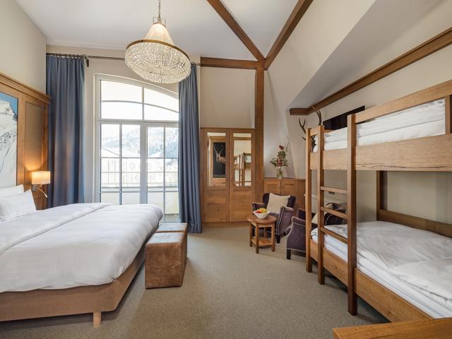 Familjerum uppdelat på två rum, ett med dubbelsäng och ett med två våningssängar, med bad/dusch och WC.