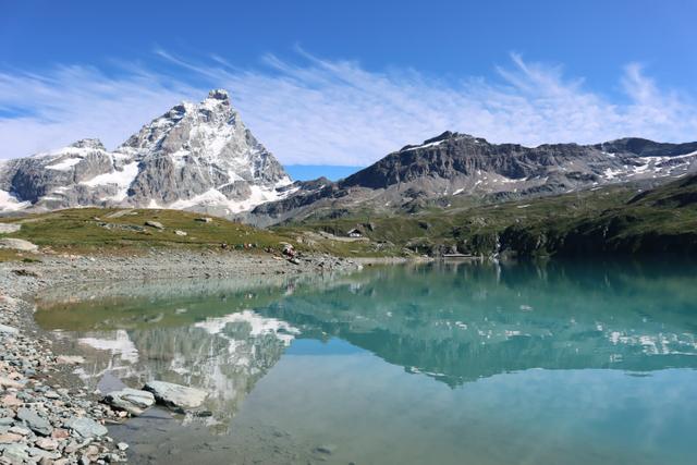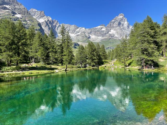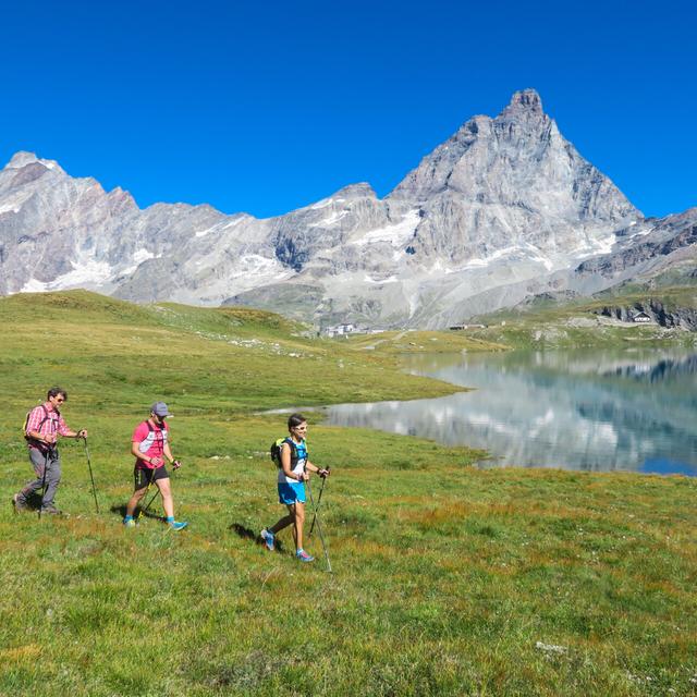 Vi inleder dagen med att ta liften upp till Plan Maison där vi till fots tar oss till alpsjön Lago Cime Bianche som är dagens högsta punkt (2850 möh). Härifrån har vi en enastående utsikt över majestätiska Matterhorn och den tre kilometer långa bergskedjan Grand Murailles, även kallad ”Den Stora Muren”. Den turkosblå sjön skapar imponerande kontraster mot de höga bergen och de gröna dalarna. Vi slår oss ner och njuter av vår medtagna picknick innan vi påbörjar vandringen nedåt. Väl tillbaka i byn finns det tid till en härlig aperitif i solen.