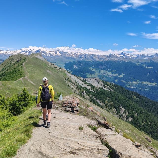 Dagen startar med en kortare bussfärd till Cheineil (2 100 möh), ett område som är känt för sin helikopterskidåkning under vinterhalvåret. Härifrån vandrar längs med den kända vandringsrutten Grande Balconata del Cervino som bjuder på otrolig utsikt över dalen och mot den pittoreska alpbyn Torgnon. Vi passerar Colle Cheneil och fortsätter längs en vacker stig ner till den lilla byn Chamois där det är dags för en god och välförtjänt lunch. Vid klart väder erbjuds en mäktig utsikt över de tre grandiosa topparna: Grand Tournallin, Petit Tournallin och Trecare. Efter lunch följer Matterhorn oss hela vägen ner till Valtournenche där en buss väntar för att köra oss tillbaka till Cervinia igen.